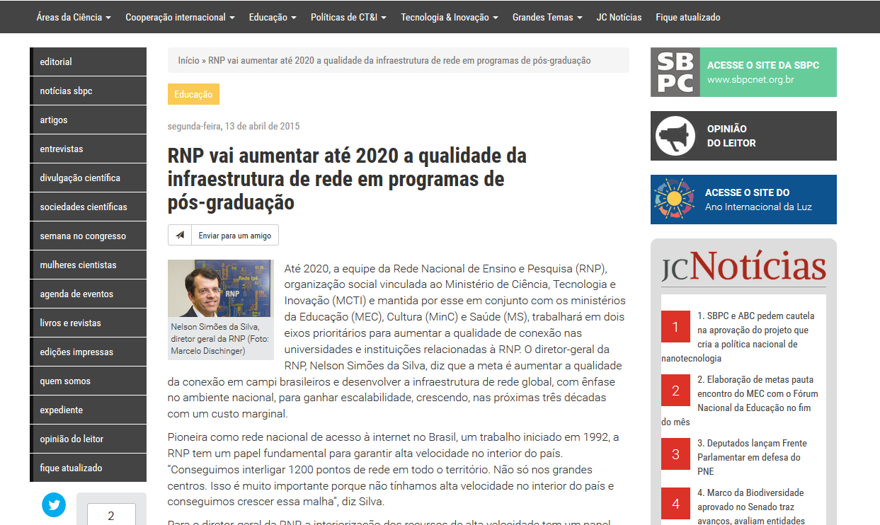 Jornal da Ciência destaca metas da RNP para 2020