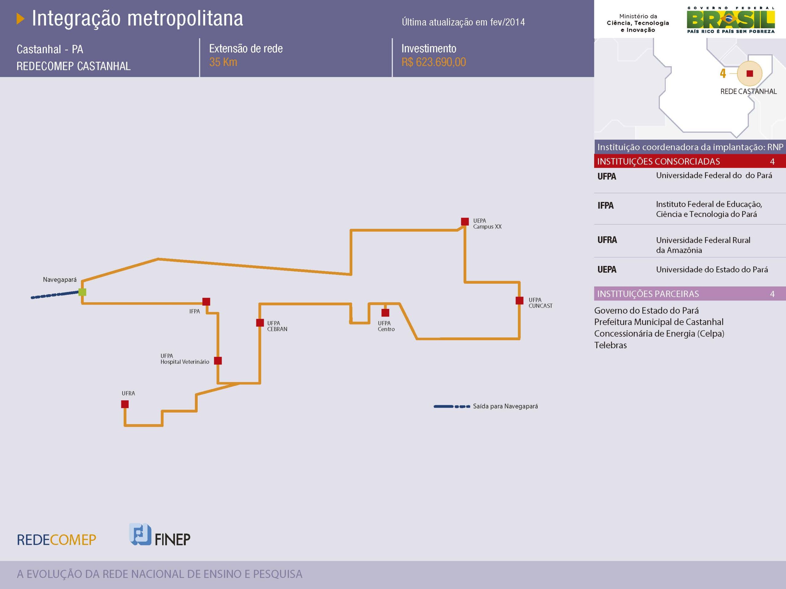 No dia 11/2, foi ativado o enlace da Rede Metropolitana de Castanhal, município do interior do Pará. O anel ótico compreende um circuito de 100 Mb/s e atenderá à comunidade local. A rede possui 35...