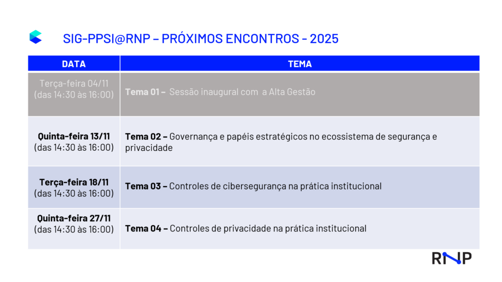 O grupo nasce inspirado no sucesso do SIG-LGPD@RNP, responsável por apoiar centenas de instituições no processo de conformidade à Lei Geral de Proteção de Dados (LGPD). Agora, com foco na implementação do PPSI, a nova iniciativa amplia o escopo, mirando diretamente na construção de resiliência, governança e cultura organizacional — e não apenas em medidas técnicas.